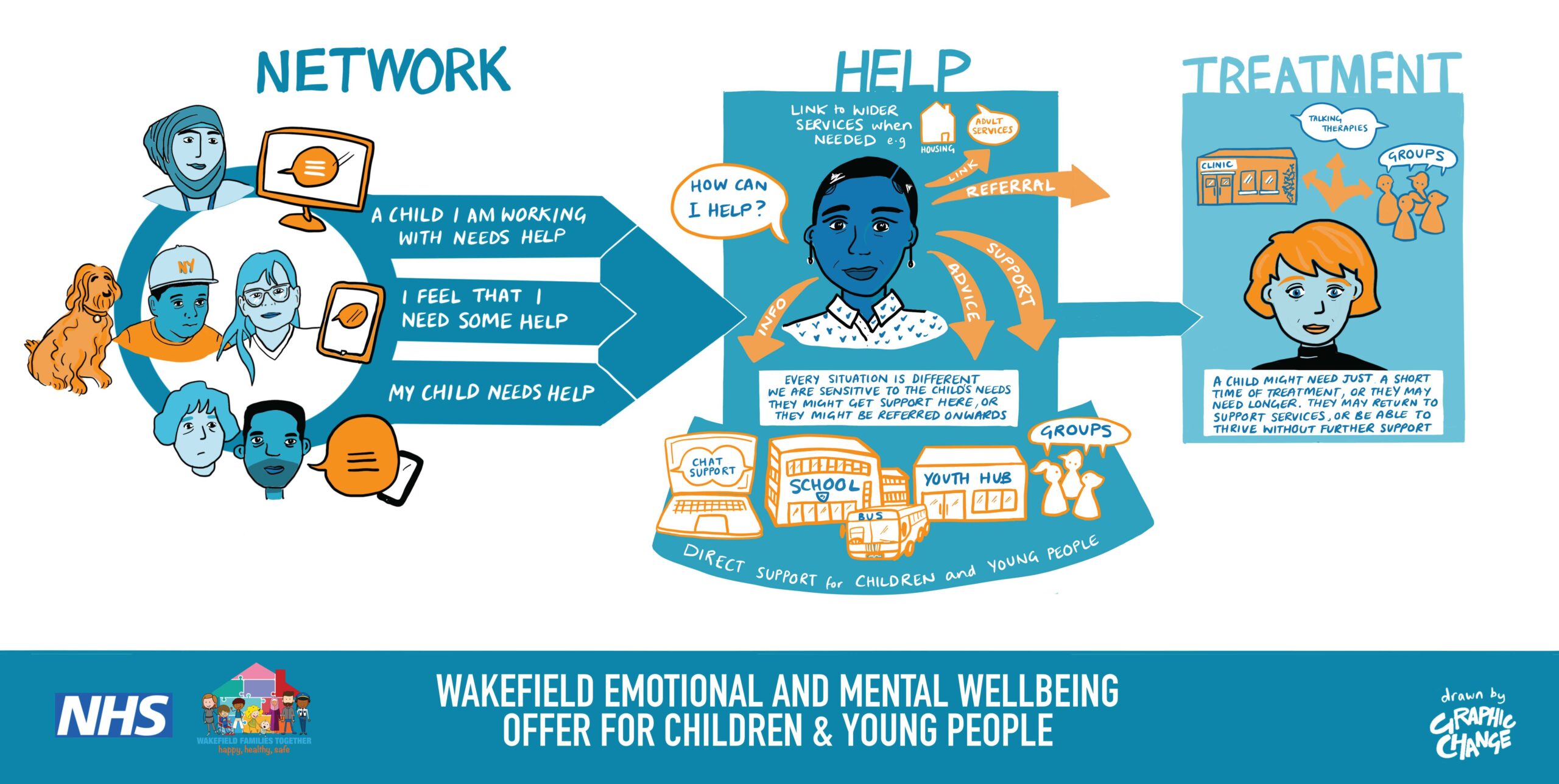 - There is broad emotional and mental wellbeing offer for children and young people living in Wakefield District. Most children are supported within their family and social network. When they need help, they are able to access this easily in different ways. And CAMHS support children who need treatment for their mental health.